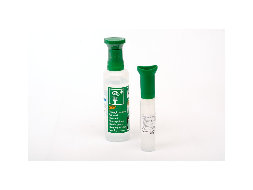 Láhve se sterilním roztokem chloridu sodného (0,9%) k vypláchnutí cizích těles z oka. Láhev s ergonomicky tvarovaným očním kalíškem a protiprachovým krytem.